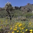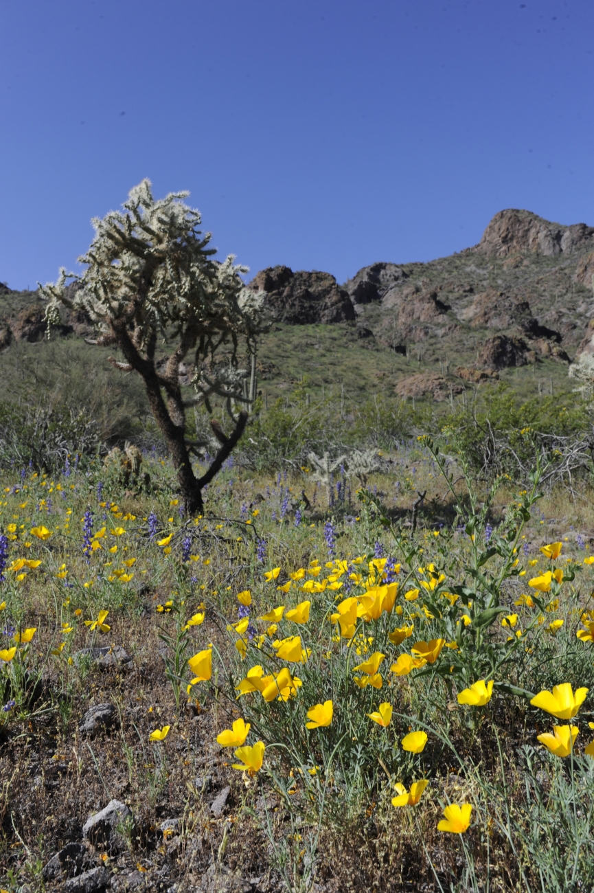 A solitary chainfruit cholla stands among wildflowers in a scenic view of the Sonoran Desert on the Cabeza Prieta National Wildlife Refuge.