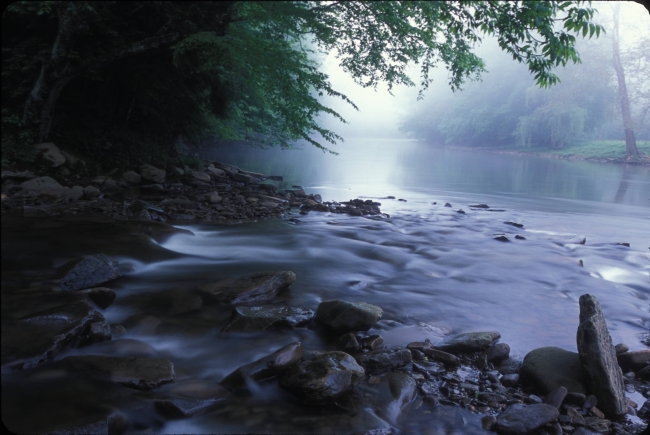 View of the rocky shoreline of the Cheat River at Shaver's Fork in West Virginia.