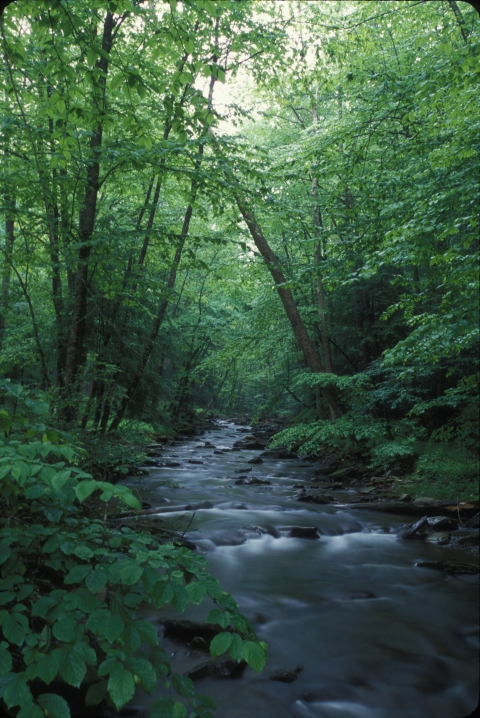 Shaver's Fork on the Cheat River running through densely forested area