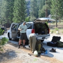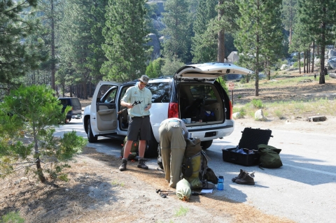 Checking gear for hike. Hiking to Center Basin through Sequoia and Kings Canyon National Parks. National Park Service frog survey crew along on hike.