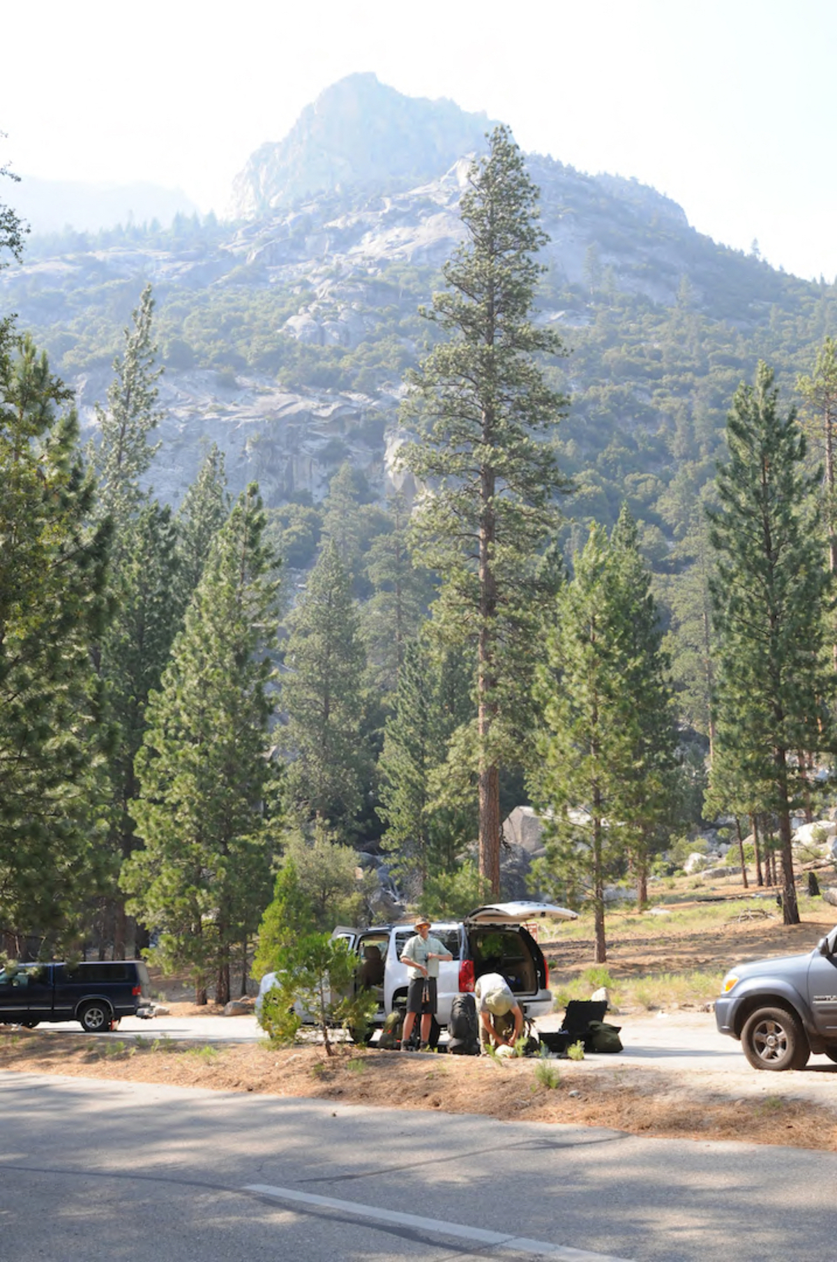 Checking gear one last time before hike. Hiking to Center Basin through Sequoia and Kings Canyon National Parks. National Park Service frog survey crew along on hike.