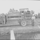 Equipment used for chemically treating fish ponds to control vegetation. Chemical used is sodium arsenite. Personnel in photo - left to right: Glenn F. Adams, foreman; J. C. Standier; and W. O. Cox