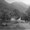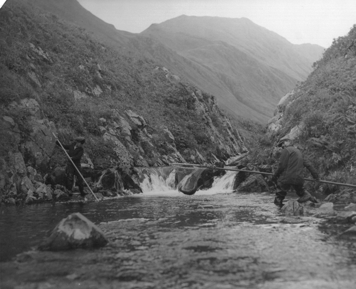 Mike Houdikoff, Chief of Attu village and his son netting sockeye salmon.