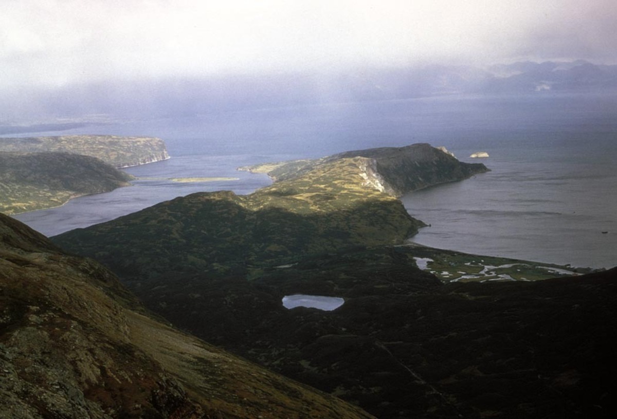 Foggy view of Chignik Mountain in the Aleutian Islands with a large crater in the photo.