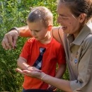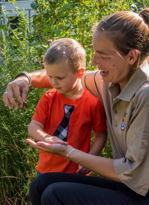 Child looks on as U.S. Fish and Wildlife Service employee handles monarch