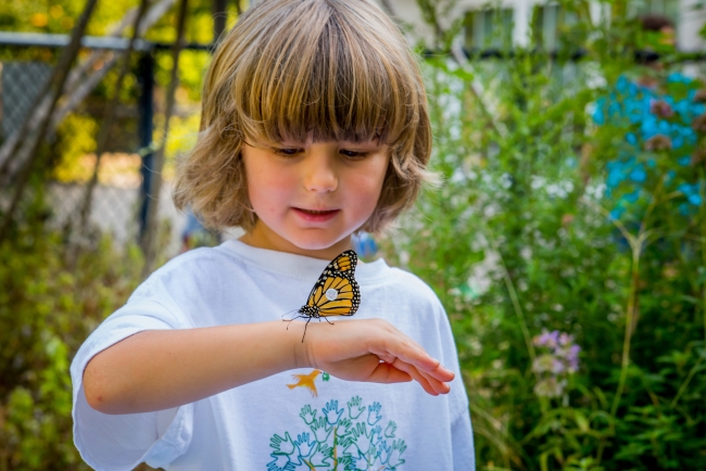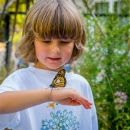 Child observes tagged monarch on hand