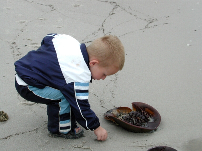 Child playing with horseshoe crab