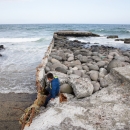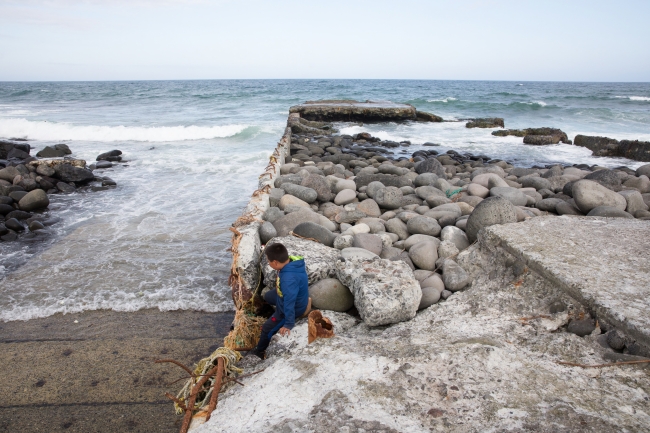 A child sits on the remains of the East Landing boat launch, where the entire village of St. Paul was evacuated during WWII.