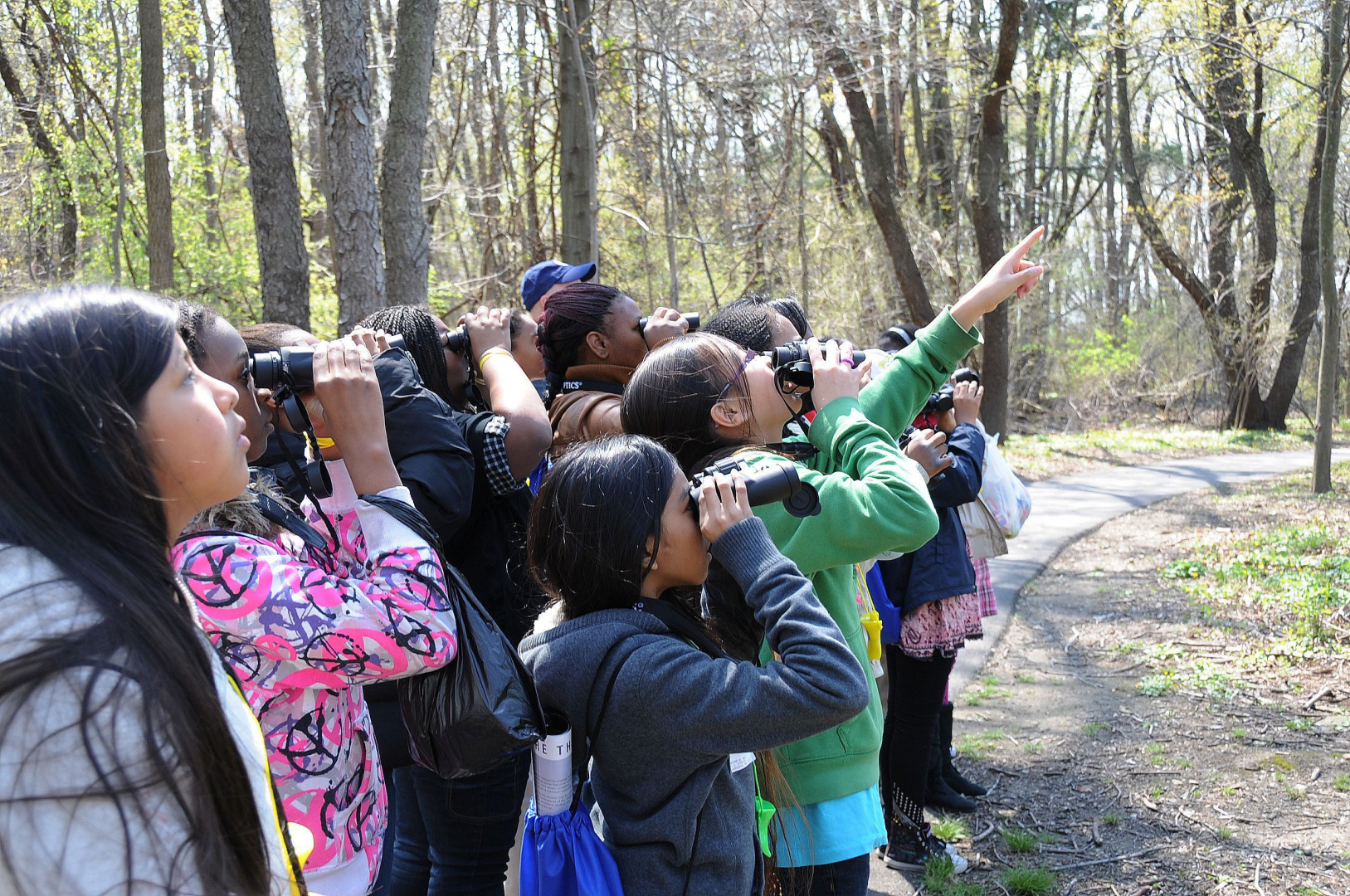 Children look at birds through binoculars and point at John Heinz National Wildlife Refuge at Tinicum.