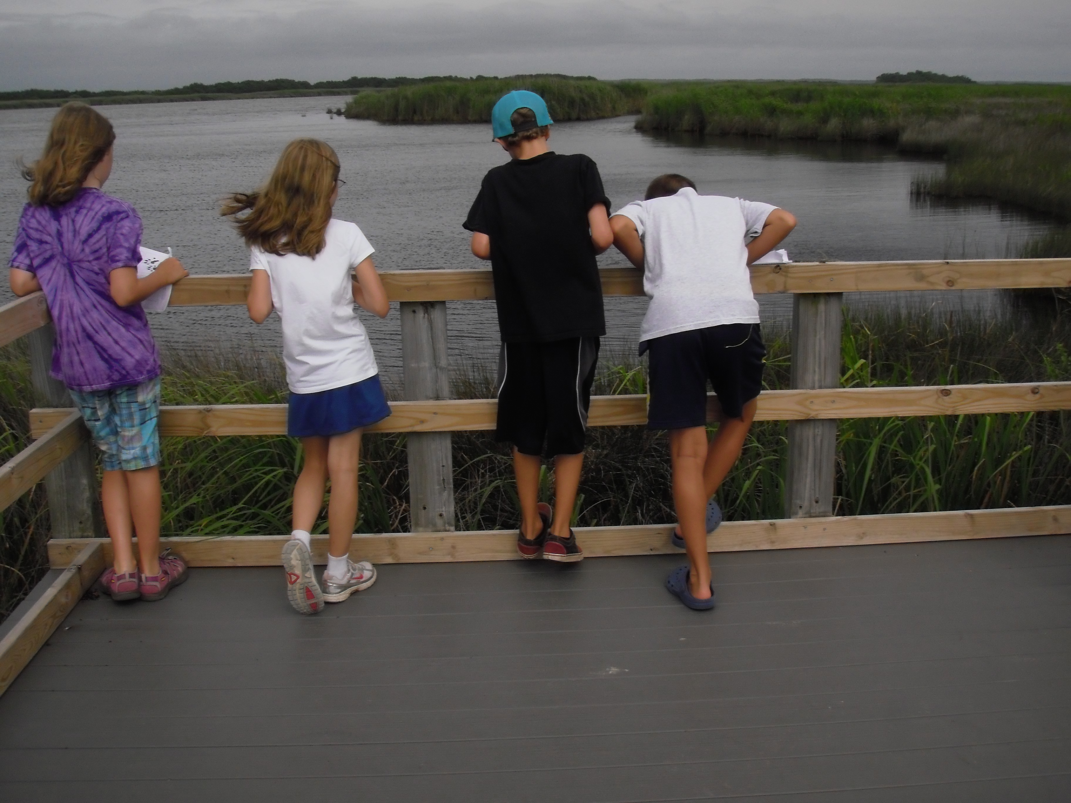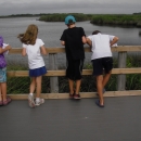 Young participants in an education program at Back Bay National Wildlife Refuge in Virginia observe wildlife and plants from a raised platform.
