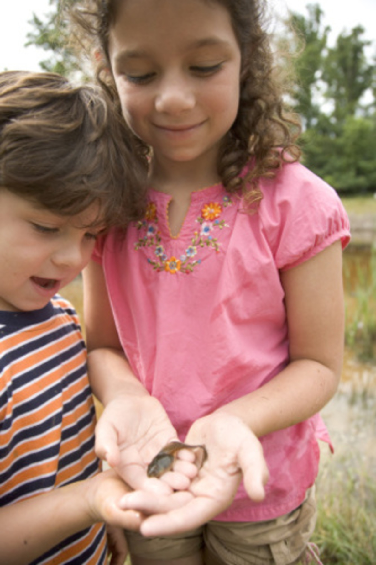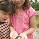 Close view of young boy and girl holding tadpole they caught with net and bucket in pond. This image was used in the "Children and Nature" Conference at the National Conservation Training Center.