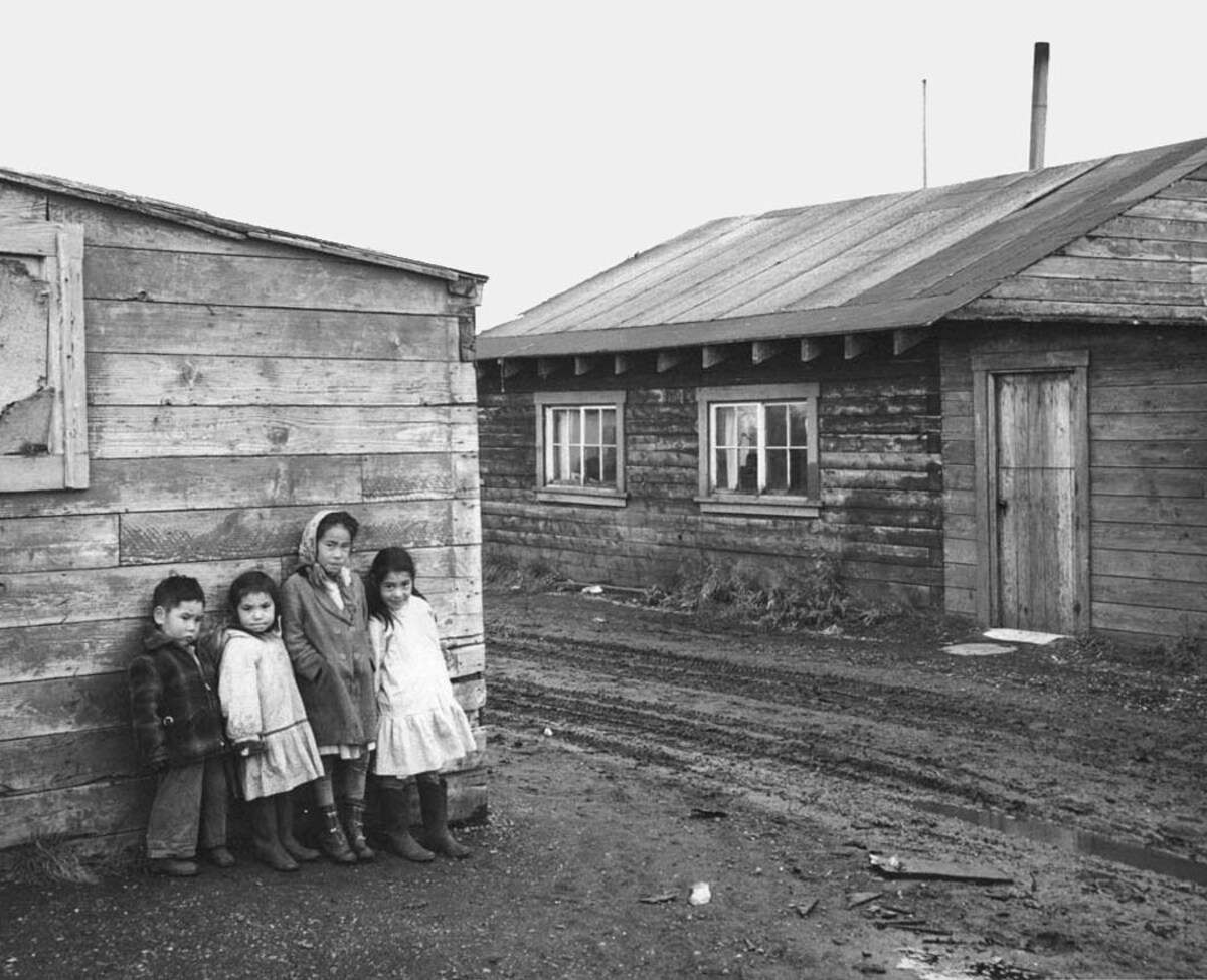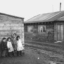 The Pribilof Report 1949; Children standing by Native Alaskan homes in Kotzebue. Although not within the Selawik NWR boundary, Kotzebue is home of the Selawik NWR office. Selawik National Wildlife Refuge; Native Americans; ARLIS; Alaska; FWS-1682