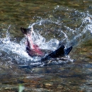 A male Chinook salmon, with red coloration, strikes another male Chinook on Clear Creek in Redding, California, during spawning season in October 2020.