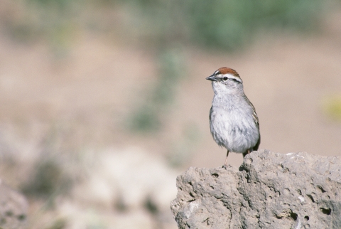 Chipping sparrows are similar to other sparrows with rusty crowns but have a white supercilium and black eye line in spring and summer. Field sparrows have a pink bill and white eye ring. Swamp Sparrows have rusty wings and a dingy breast. Deshutes National Forests in Oregon.