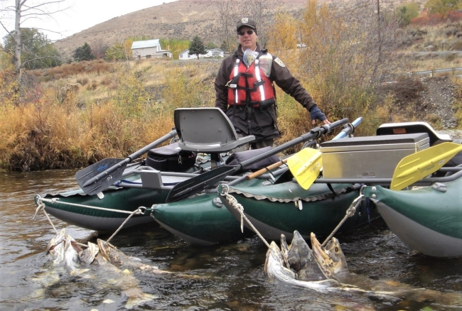 Chuck Hamstreet on the Entiat River with Chinook salmon carcasses collected for sampling. USFWS Photo: Courtesy of Jim Craig