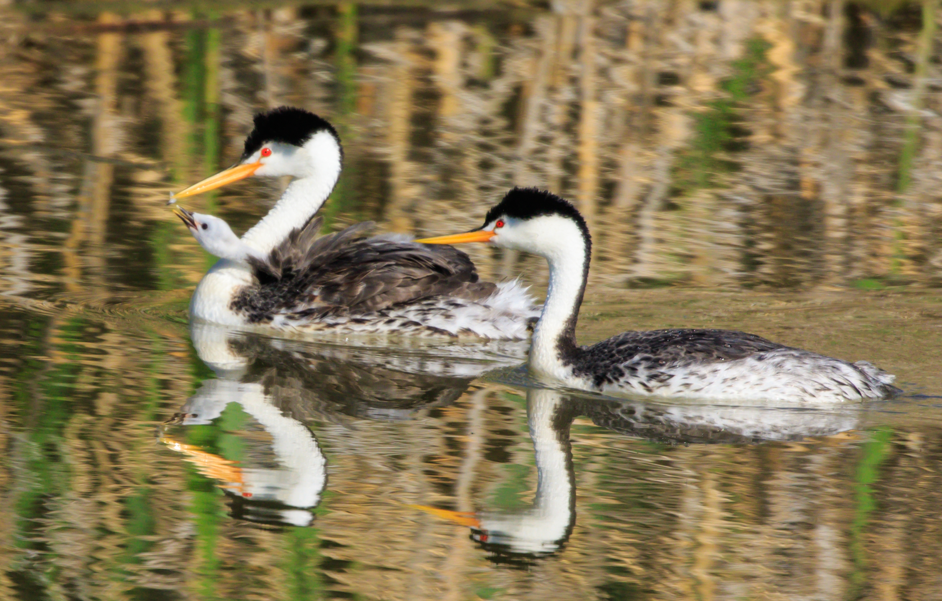 A Clarks grebe family swims at Bear River Migratory Bird Refuge in Utah, a destination at the Great Salt Lake Bird Festival in May.
