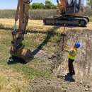 Engineering Equipment Operator Brandon Jordan using a laser level and strike team employee Trevor Browne operating the excavator to clean and regrade a ditch to improve efficiency of water movement across San Luis National Wildlife Refuge. Credit: Sean Brophy/USFWS