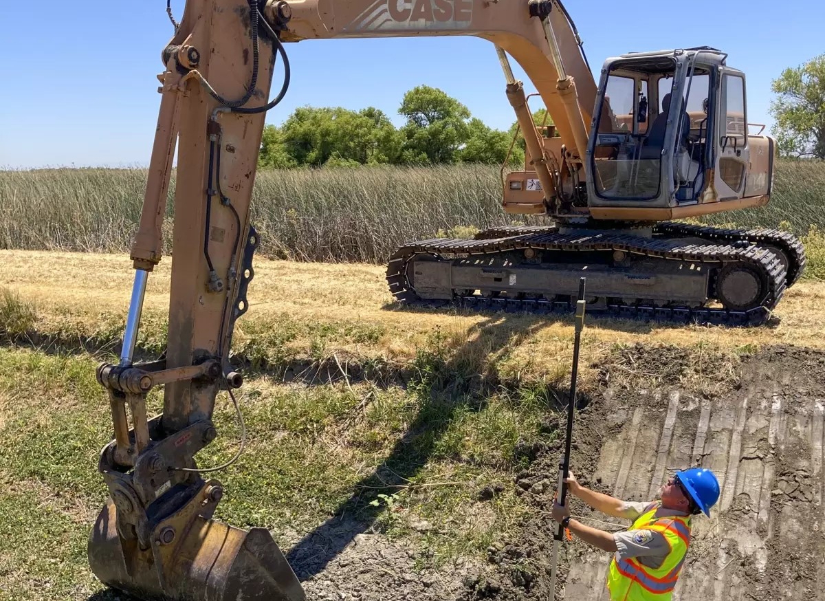 Engineering Equipment Operator Brandon Jordan using a laser level and strike team employee Trevor Browne operating the excavator to clean and regrade a ditch to improve efficiency of water movement across San Luis National Wildlife Refuge.