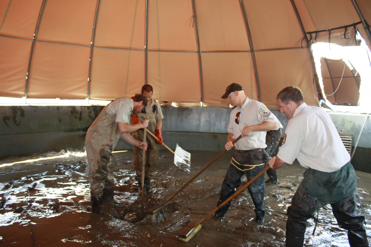 USFWS staff cleaning river sediment from interior of circular fish rearing pool. River water and sediment from the Hurricane Irene flood event breached some of the circular fish rearing pools. Some fish escaped and were left stranded by receding flood waters.