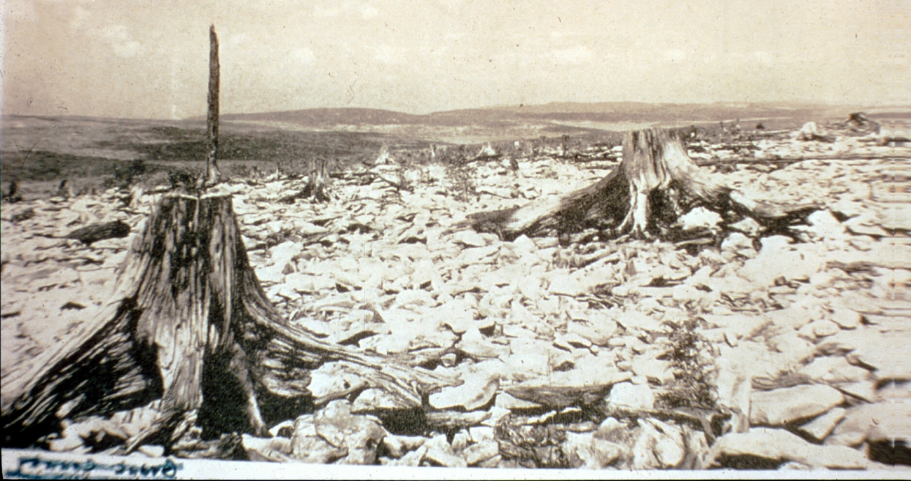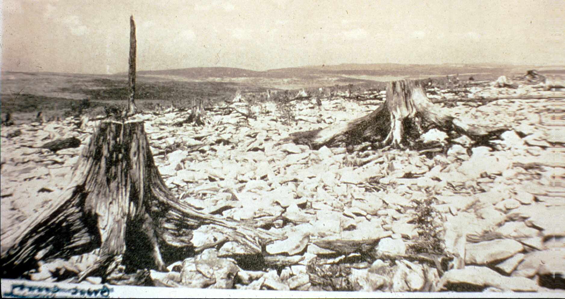 Black and white photo of stumps in Canaan Valley after clear-cutting
