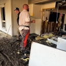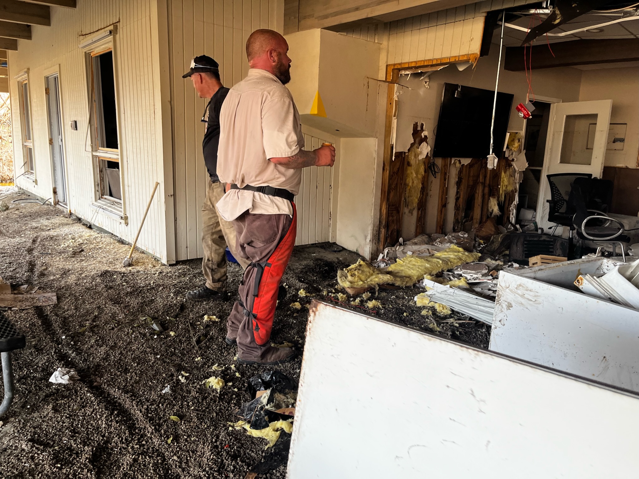 Fish and Wildlife Service staff clear debris from the ground floor of the office building at J.N. "Ding" Darling National Wildlife Refuge in Florida after Hurricane Ian to keep water and mold from seeping into the floor above.