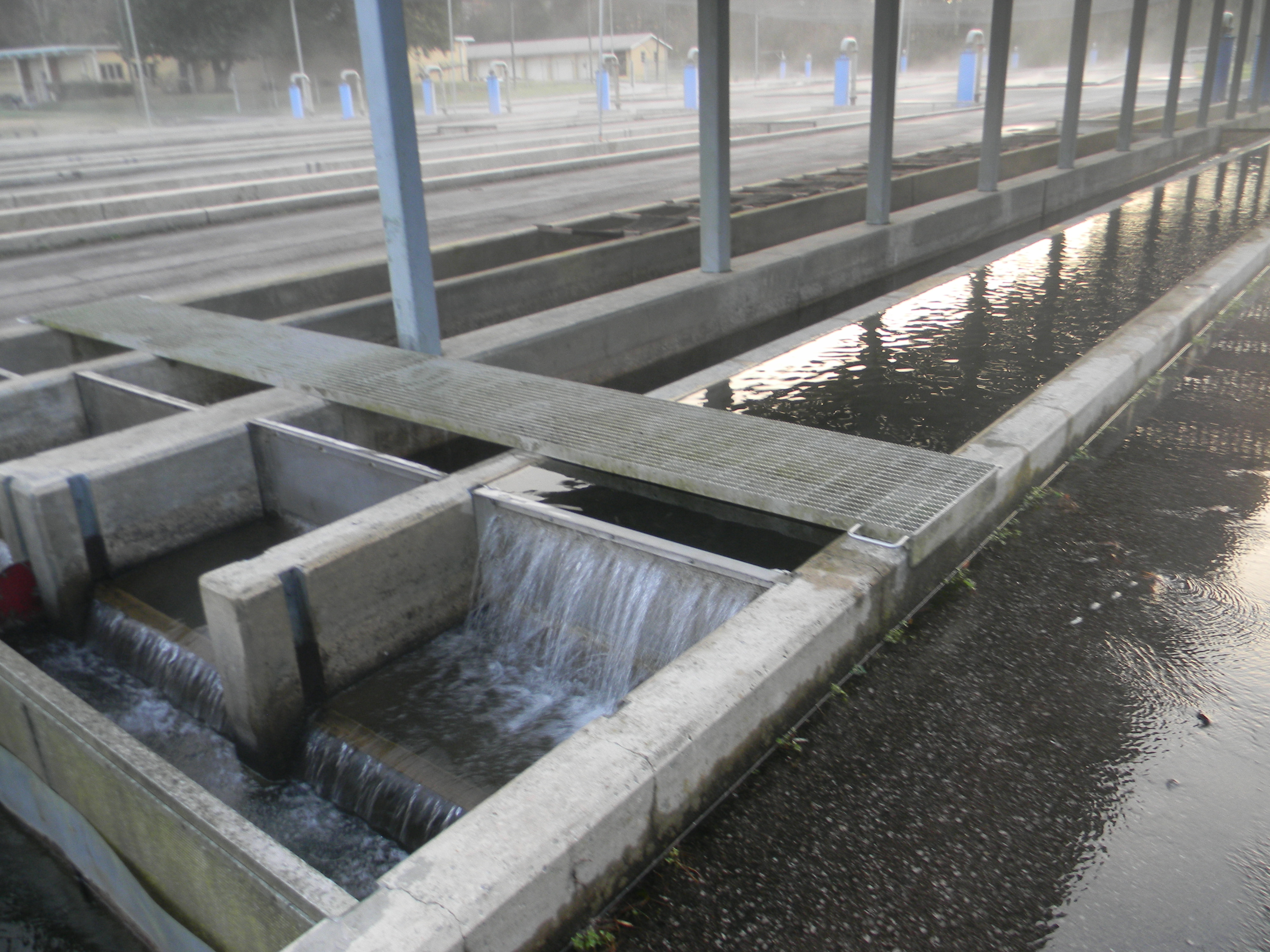 Fish screens slot sizes are as large possible while still keeping the target fish sized within the rearing area. The smaller hole sizes used on the smaller fish can clog quickly from algae, feed particles, fall leaves, random debris and fish mortalities. Each raceway is inspected daily all year long.