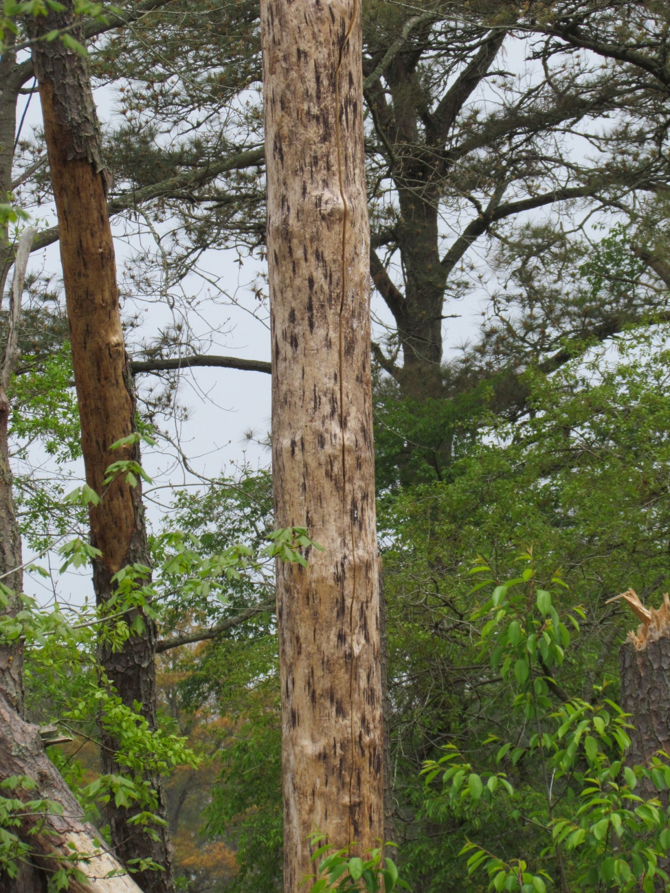 It has been said by many that the native Southern Pine beetle, Dendroctonus frontalis, is one of the most destructive insect pests to pines. Here at Chincoteague National Wildlife Refuge, Loblolly Pine trees are a haven to the Southern Pine beetle for shelter, breeding, nesting, and feeding. These beetles chew and burrow their way through the bark and the inner parts of the tree, killing a healthy tree in a month. Many of the pine trees on Chincoteague National Wildlife Refuge are the perfect habitat for the Southern Pine beetle. Sadly, the tree that allows the beetle to survive will quickly die. A large number of the Loblolly Pine trees, found on Assateague Island are reaching the end of their lifespan and are also affected by salt stress due to sea level rise. Since the trees are already weakening, they make a good starting habitat for the Southern Pine beetle because it is easier to break the tree’s defenses.