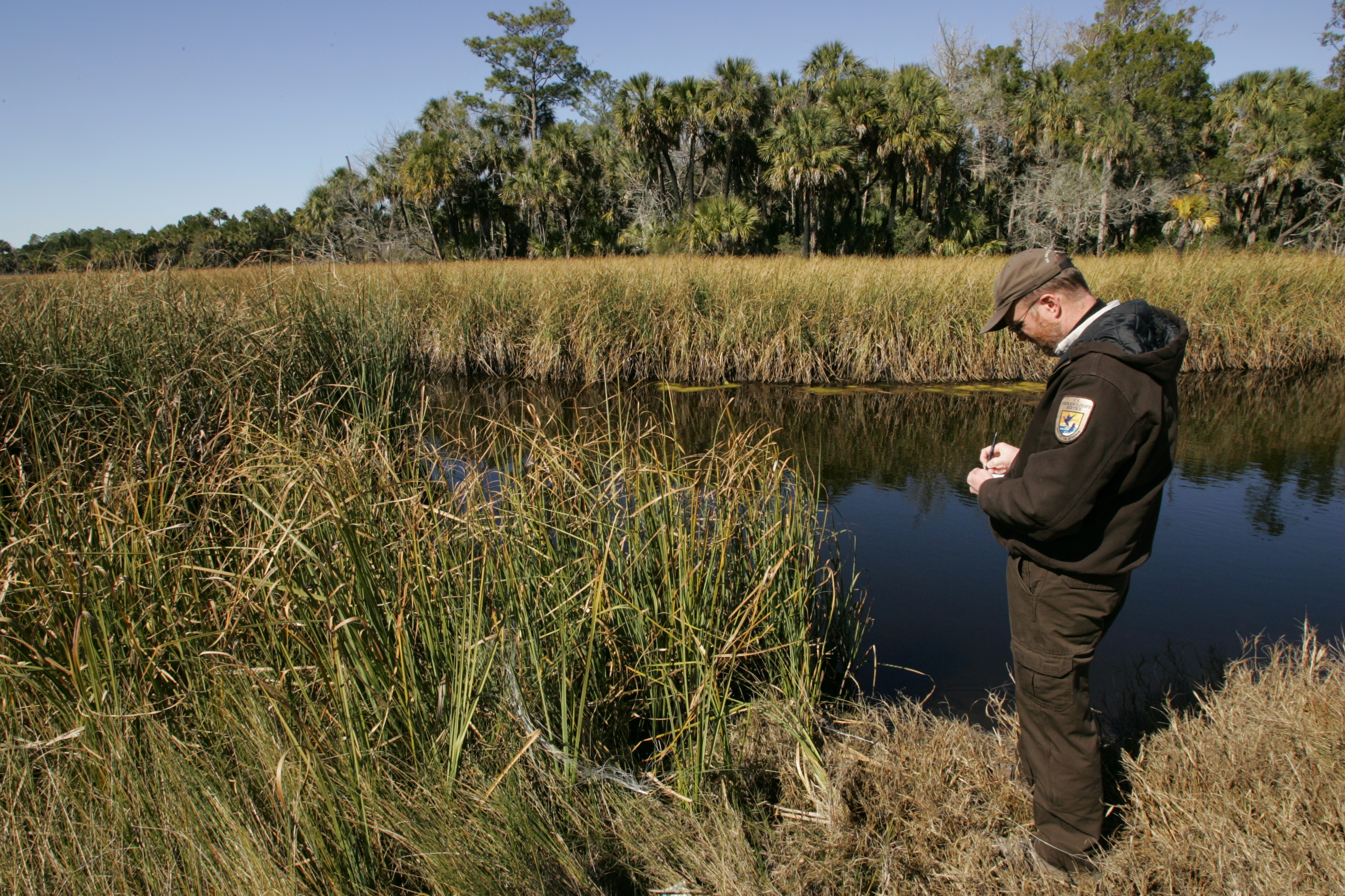 A FWS employee stands writing by coastal marshlands.