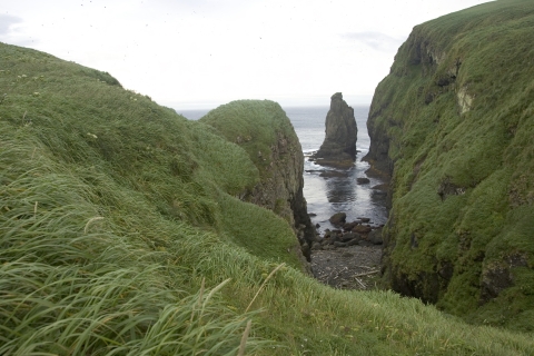This picture shows a grassy back drop from the coastal area of the refuge looking forward to the water. The Arctic National Wildlife Refuge is home to some of the most diverse and spectacular wildlife in the arctic. The Refuge's rich pageant of wildlife includes 42 fish species, 37 land mammals, eight marine mammals, and more than 200 migratory and resident bird species.