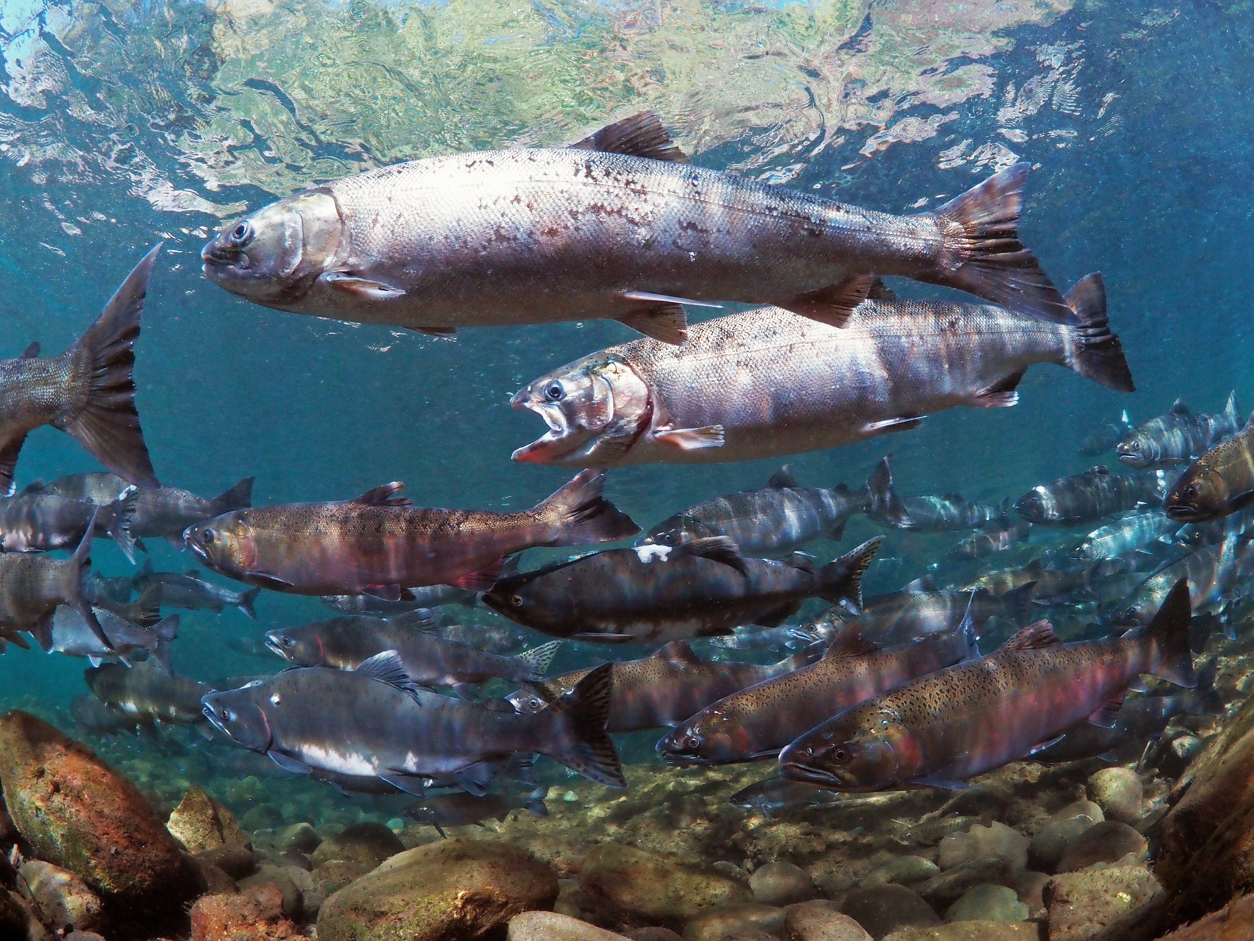 Roger Tabor's underwater photography gives us an up-close look at aquatic species in their habitats. Here, Tabor puts us face to face with Coho and pink salmon in the Quilcene River on Washington's Olympic Peninsula.