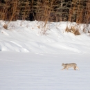 A collared lynx crosses the frozen river. Lynx Project At Yukon Flats National Wildlife Refuge.