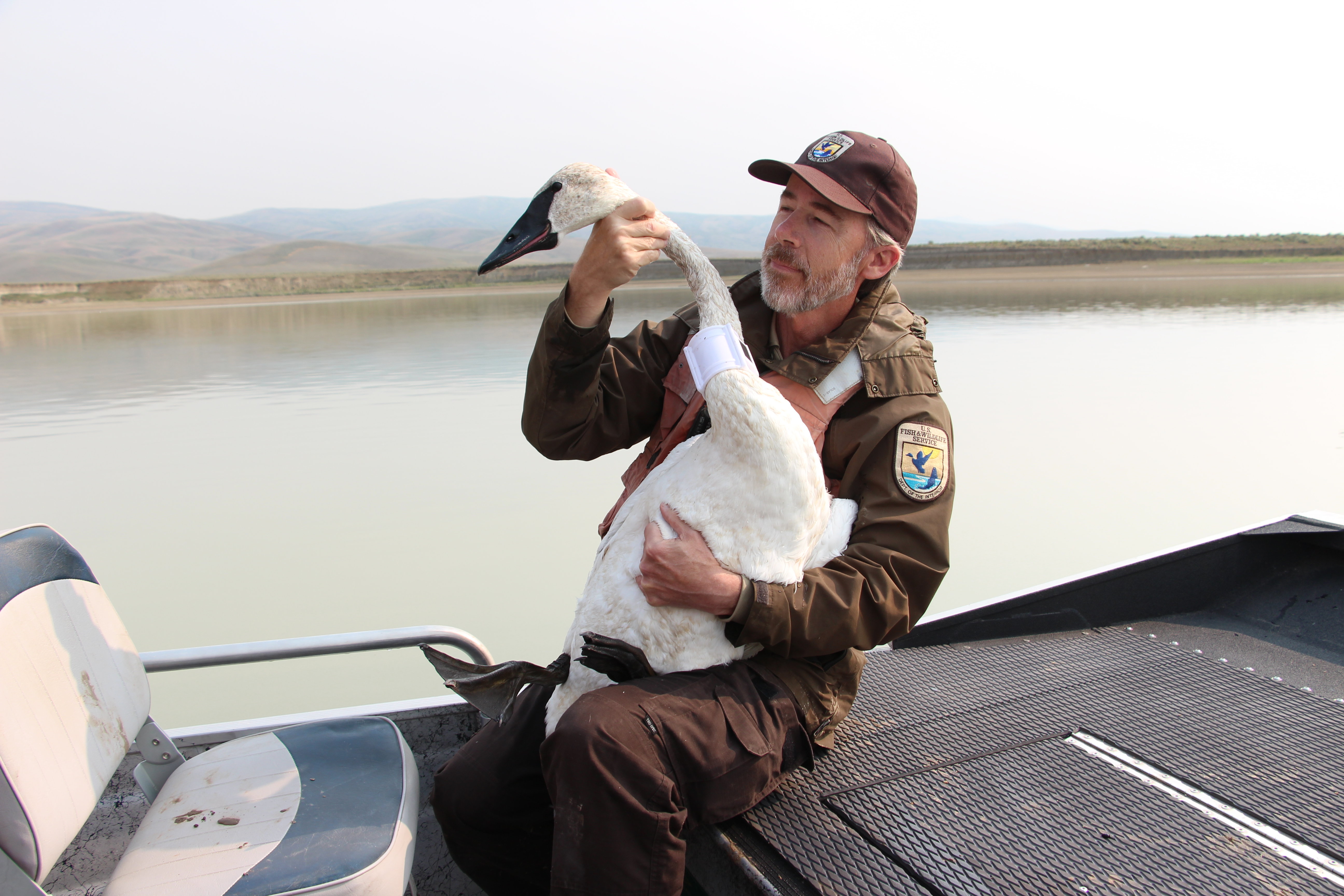 Refuge Manager Mike Bryant (2019-2025) holds a trumpeter swan and prepares to release it after it has been fitted with a solar-powered GSM transmit neck collar to help learn more about swan migration patterns. Photo by Cortez Rohr/USFWS.