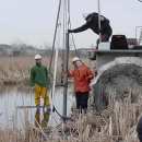 Three men use equipment to take core samples at Roxanna Marsh, Grand Calamut River in Hammond, Indiana as part of a wetland restoration effort and damage assessment process.