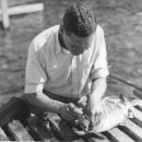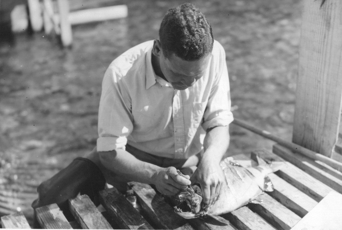 Karluk River, Kodiak, Alaska. FWS employee obtaining otoliths from Red Salmon for age determination. Kodiak National Wildlife Refuge; Fisheries management; Work of Service; Personnel; Fishes; ARLIS; Alaska; FWS-1266