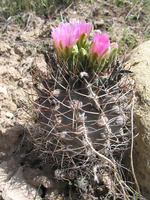 The Colorado hookless cactus is a barrel shaped cactus that ranges from 1.2 to 4.8 inches (in.) (3 to 12 centimeters (cm)) tall, with exceptional plants up to 12 in. (30 cm) tall. Stems range from 1.6 to 3.6 in. (4 to 9 cm) in diameter. The stems have 8 to 15 (typically 12 or 13) ribs that extend from the ground to the tip of the plant. Along the ribs are areoles (small, cushion-like areas) with hooked spines radiating out (Heil and Porter 2004). There are two types of spines, radial and central, defined by the size and position on the plant (see Figure 1) (74 FR 47112, September 15, 2009). The 2 to 12 radial spines are located around the margin of the areole, extending in a plane parallel to the body of the plant. The radial spines are white or gray to light brown. They are up to 0.67 in. (17 millimeters (mm)) long, and less than 0.04 in. (1 mm) in diameter. The one to five central spines (usually three) are 0.5 to 2.0 in. (12 to 50 mm) long, are generally longer than radial spines, and extend from the center of the areole. The central spines include abaxial and lateral forms. Abaxial spines are typically single, point toward the top of the plant, and are noticeably bent at the tip at an angle usually less than 90 degrees. Lateral spines are usually present in pairs on either side of the abaxial spine, but are more or less straight and diverge from the abaxial spine at an acute angle (usually 20 to 50 degrees).The flowers are usually funnel-shaped, but sometimes bell-shaped. They usually have pink to violet tepals (petal-like flower parts not differentiated into petals and sepals) with yellow stamens (the male reproductive organ of the flower), and are 1.2 to 2.4 in. (3 to 6 cm) long and 1.2 to 2 in. (3 to 5 cm) in diameter (74 FR 47112, September 15, 2009). The fruit is short, barrel-shaped 0.31 to 0.47 in. (8 to 12 mm) wide, and 0.35 to 1.2 in. (9 to 30 mm) long.