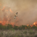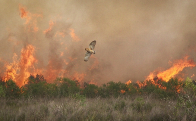 Common barn owl hunts the fire's edge for escaping prey on the Tatton Unit of the Aransas National Wildlife Refuge.