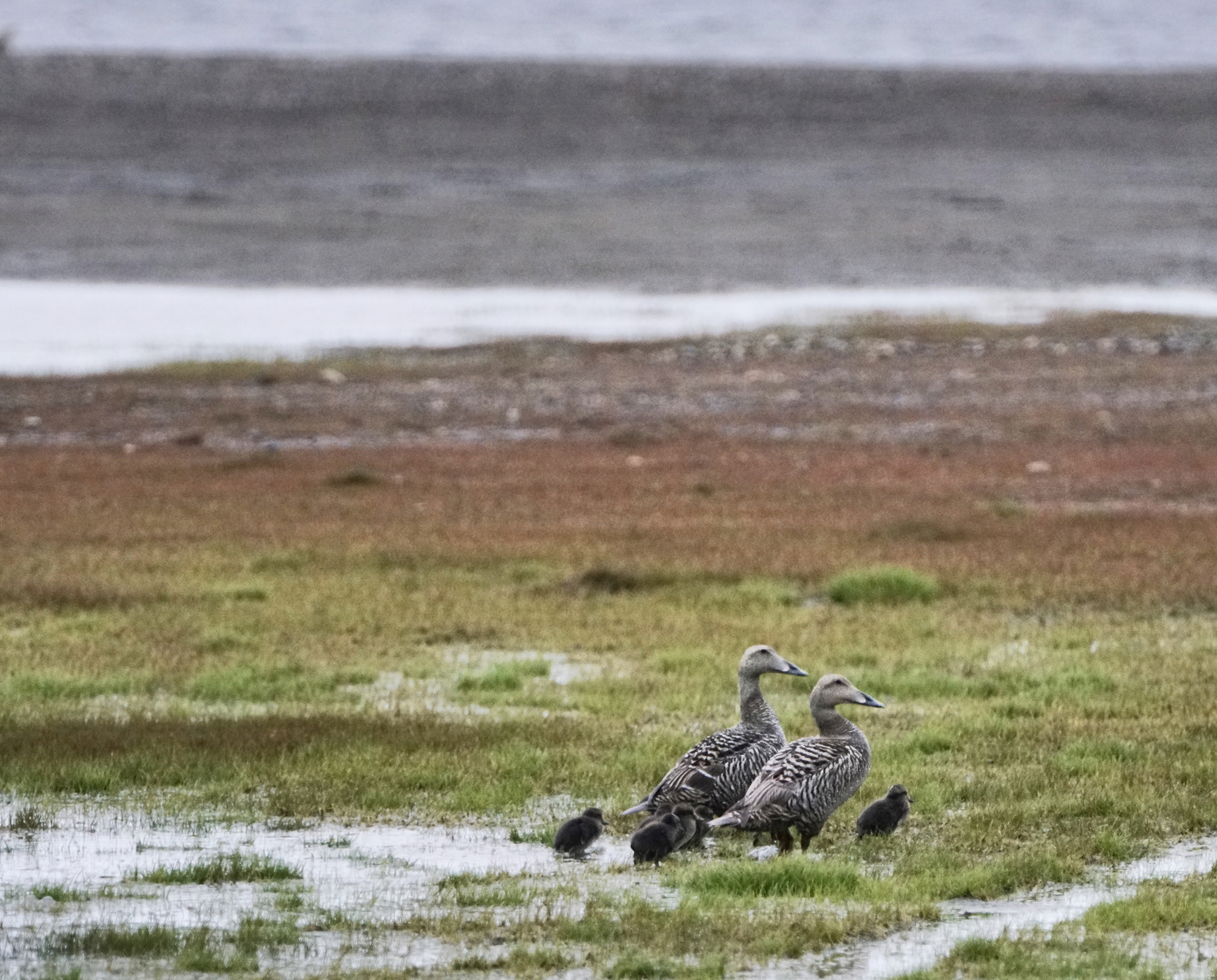Common eider females stick together to help protect their young ducklings at Arctic National Wildlife Refuge, Alaska.