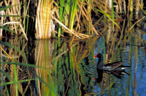 Also called Common gallinule; side view of bird swimming through quiet water with reeds in background.