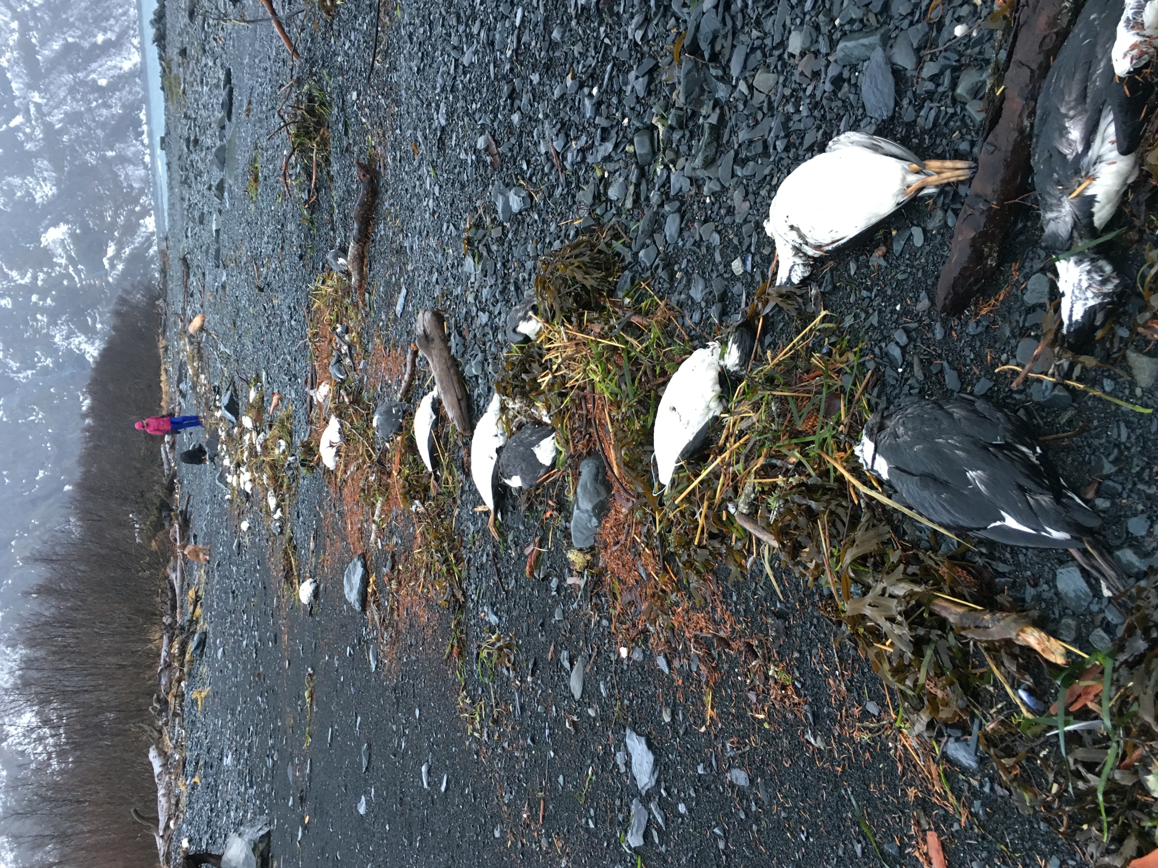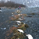 Common murres washed ashore to a beach in Prince William Sound along the tidal wrack line, part of a large scale die-off resulting from the 2014-16 marine heatwave.