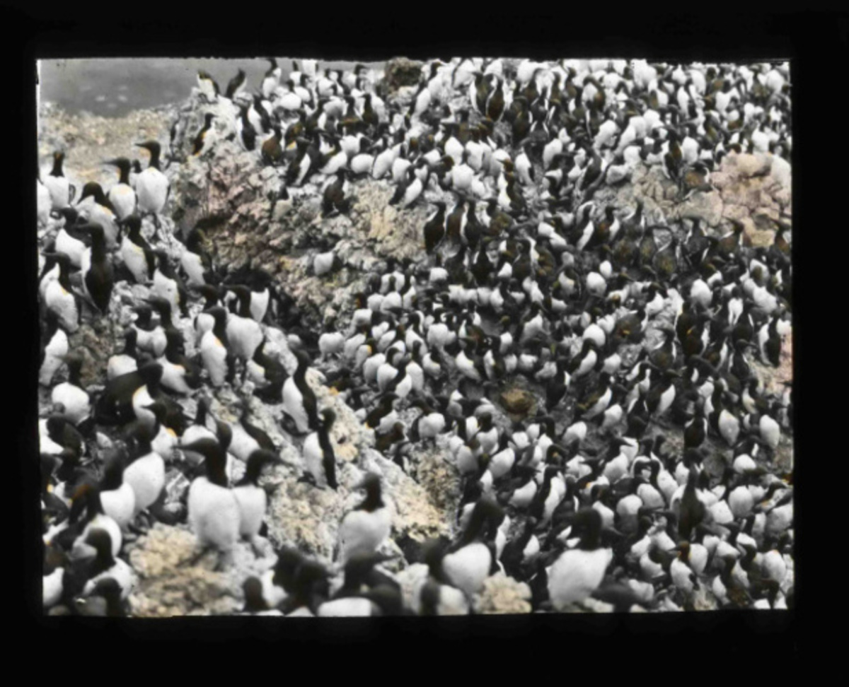 Hand painted glass slide of Common Murres at Three Arch Rocks, taken by Finley and Bohlman during a 1903 photography trip to the area that would later help Three Arch Rocks become the first bird refuge on the west coast in 1907.