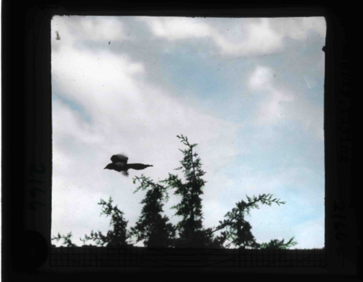 Hand painted glass slide of a Raven in Flight at Klamath Marsh in 1905 by Finley and Bohlman. Finley and Bohlman photographs would later help this area become a bird refuge in 1908.
