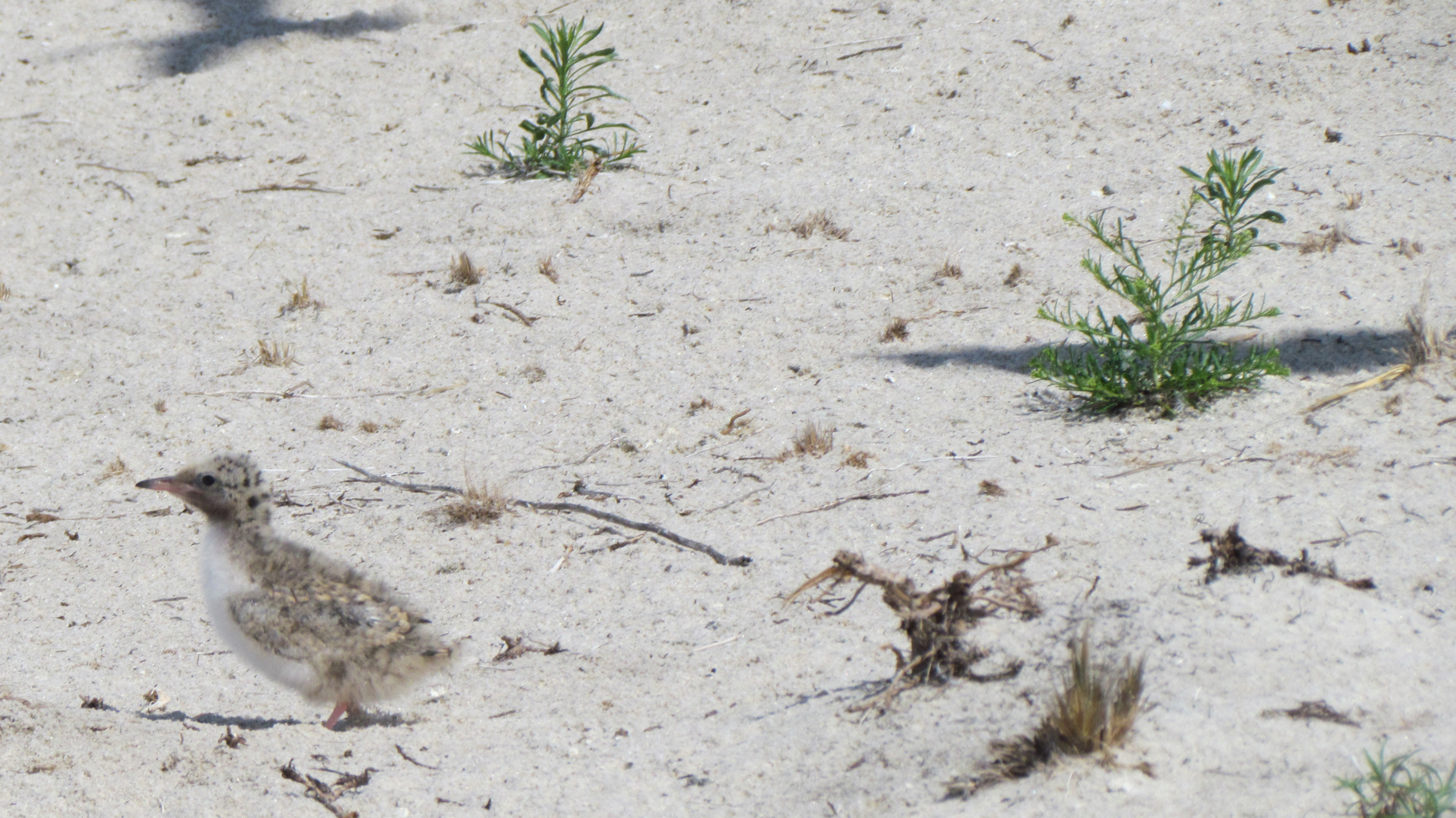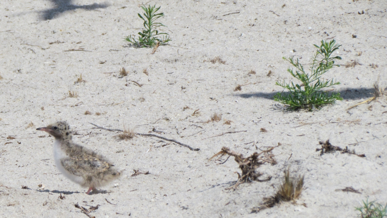 Common tern chick seeks shelter on the beach