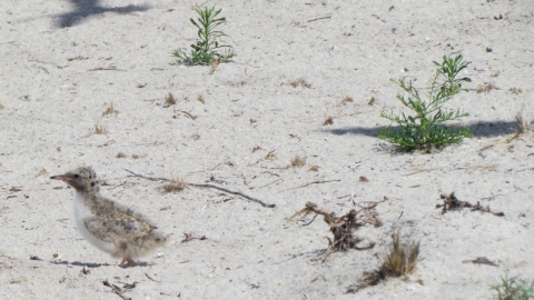 Common tern chick seeks shelter on the beach at Monomoy NWR.