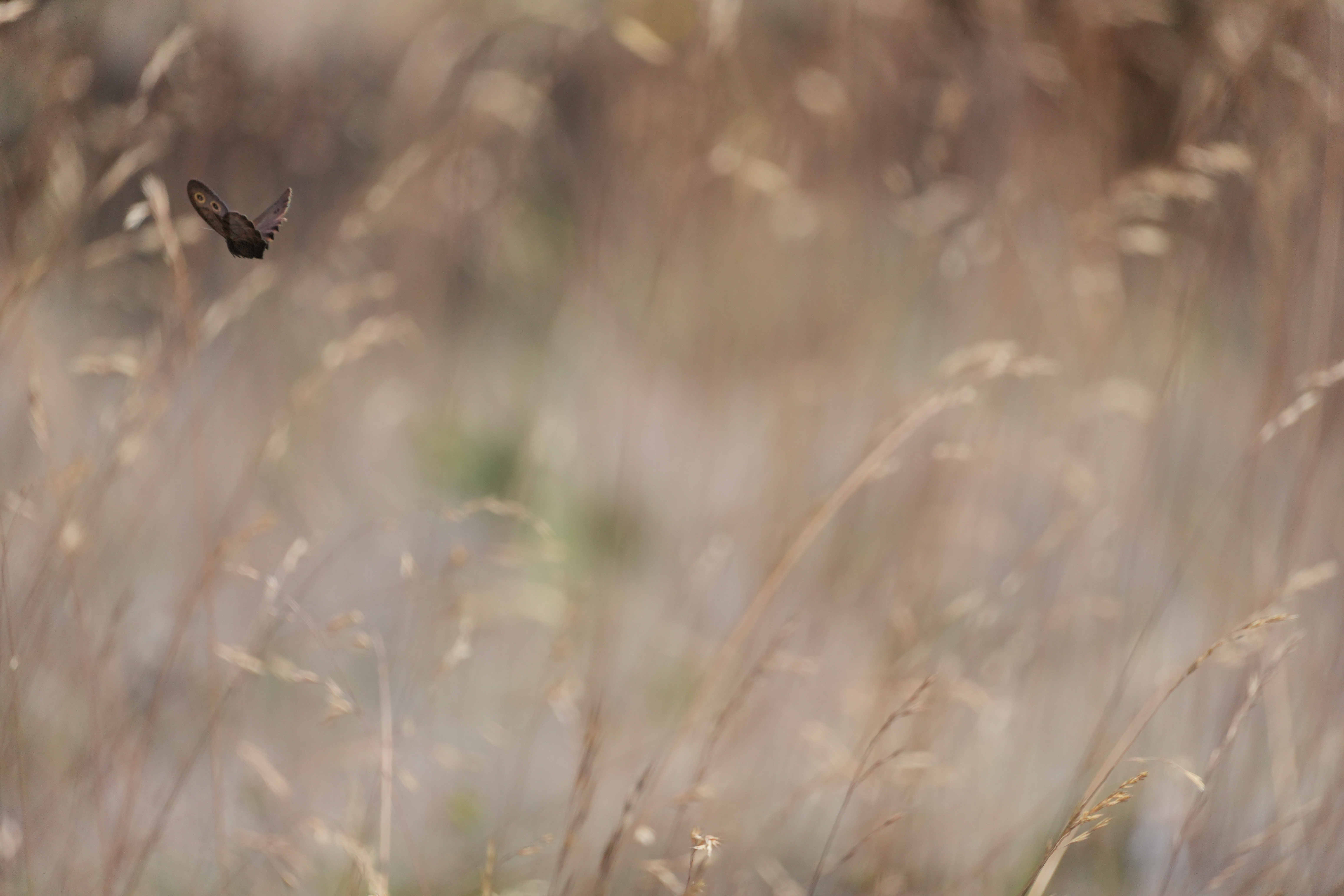 Common Woodnymph (Cercyonis pegala) flying over grass.