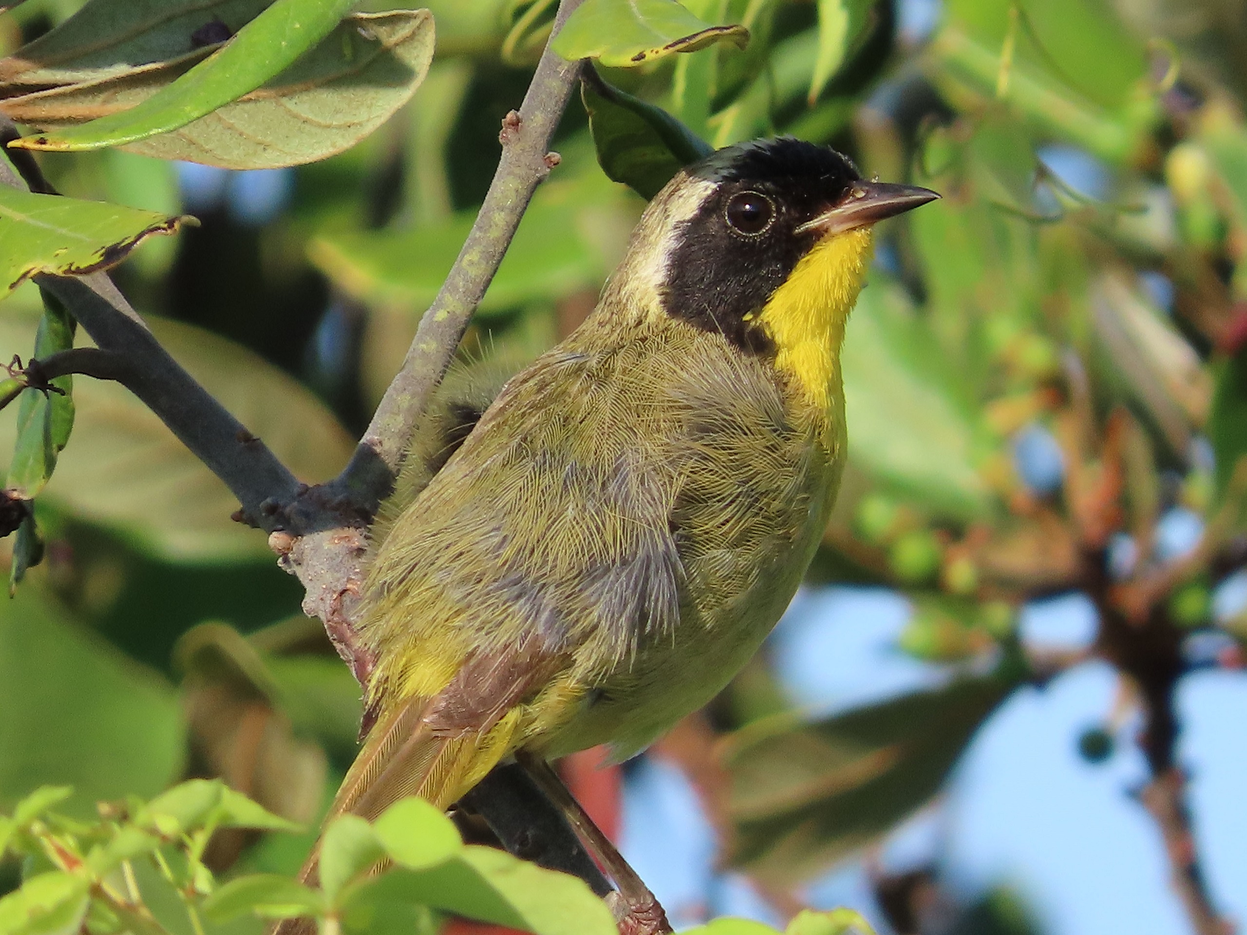 Small yellow-throated warbler with black patch across eyes standing on a branch surrounded by green leaves and blue berries