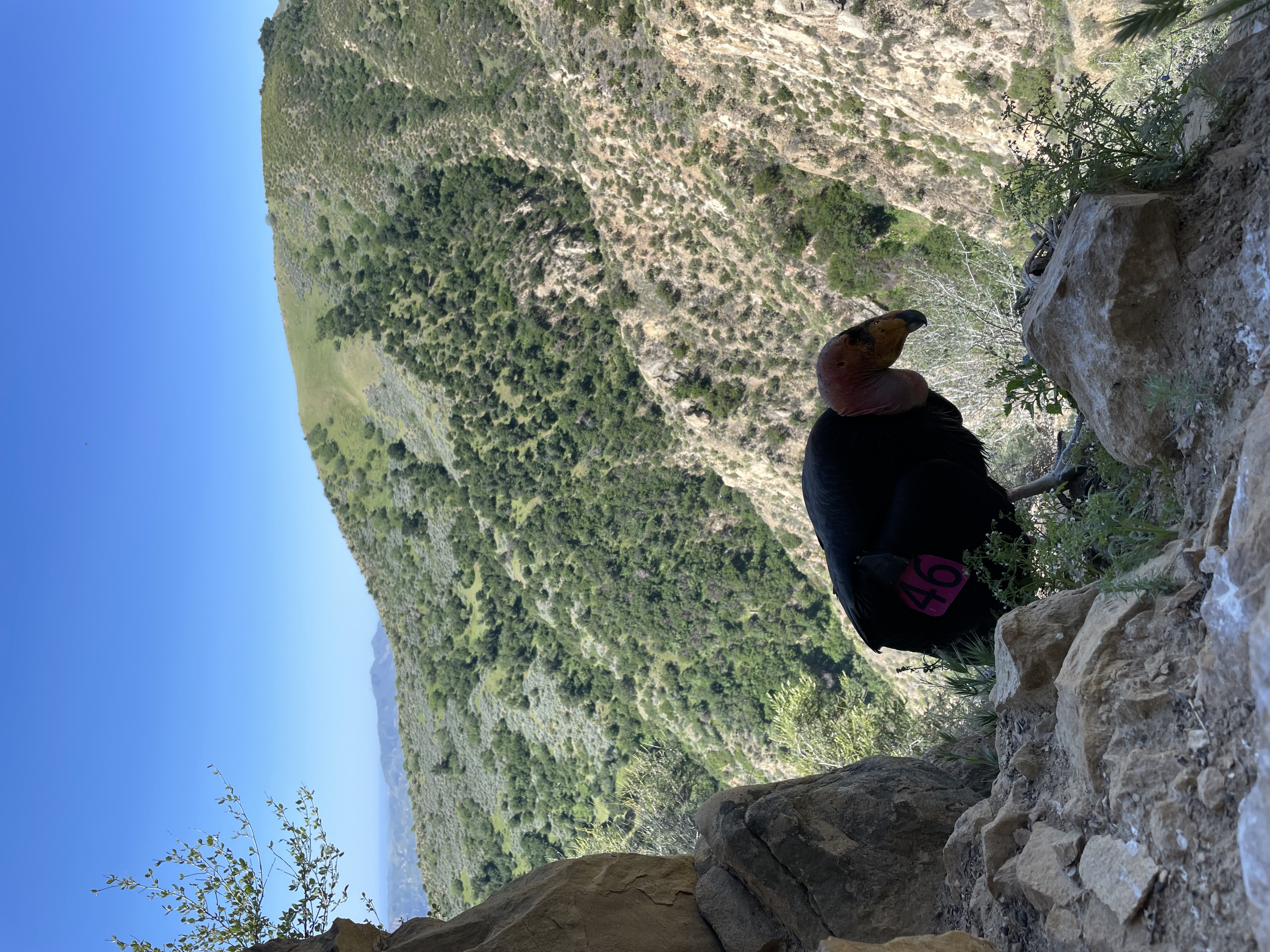 Condor #846 waits while staff conducts a fertility check. Taken on April 12, 2022. A California condor stands outside the nest cavity entrance featuring canyons in the background. Credit: USFWS