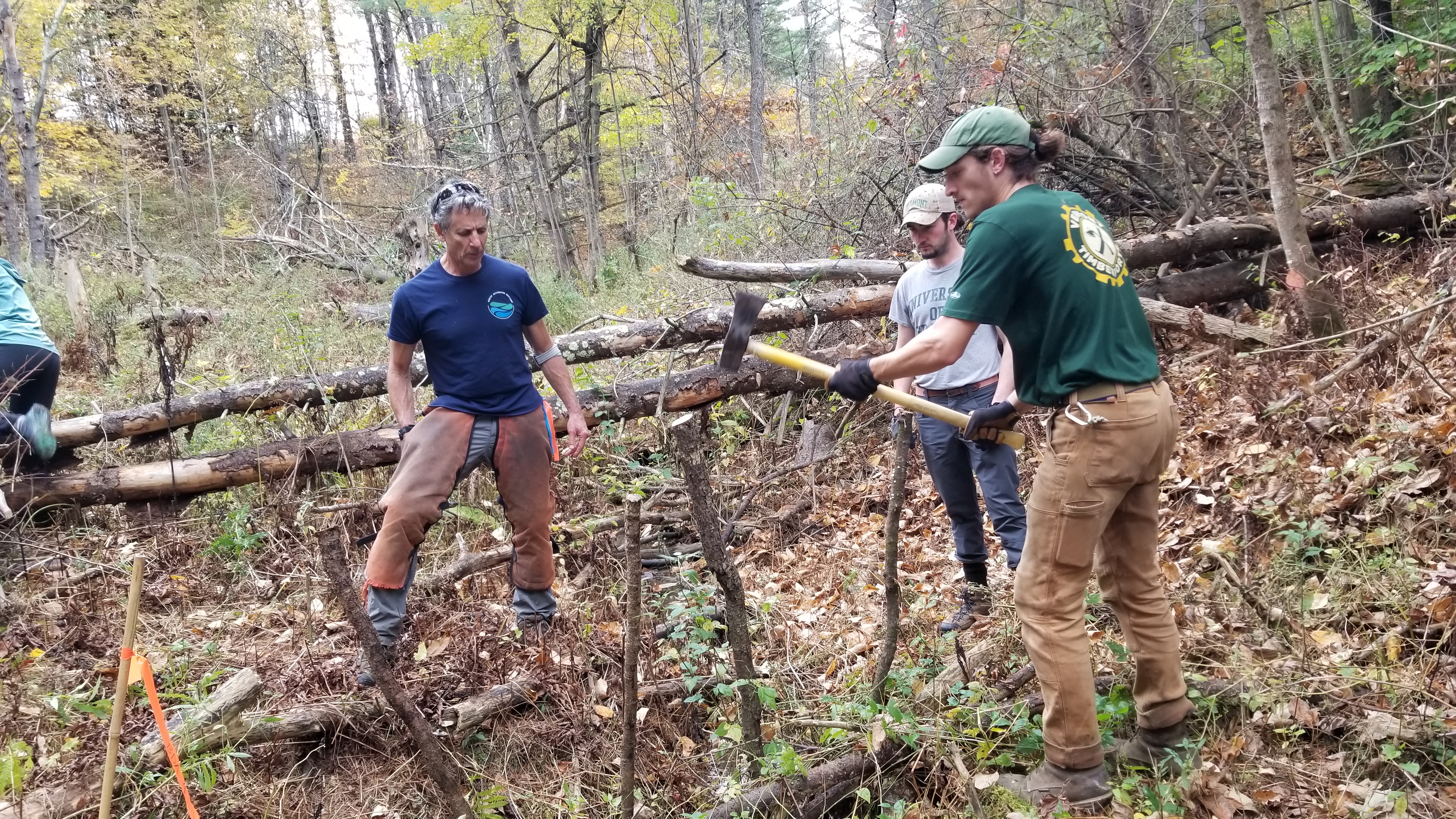 University of Vermont students work with restoration consultant Bob Hyams to build a beaver dam analogue on construction day, October 2021.