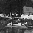 Personnel rafting lumber ashore for construction of Katlian Bay salmon migrant station. L-R Albert Lobo, Captain Milton Harenden of the FWS boat "Scoter."