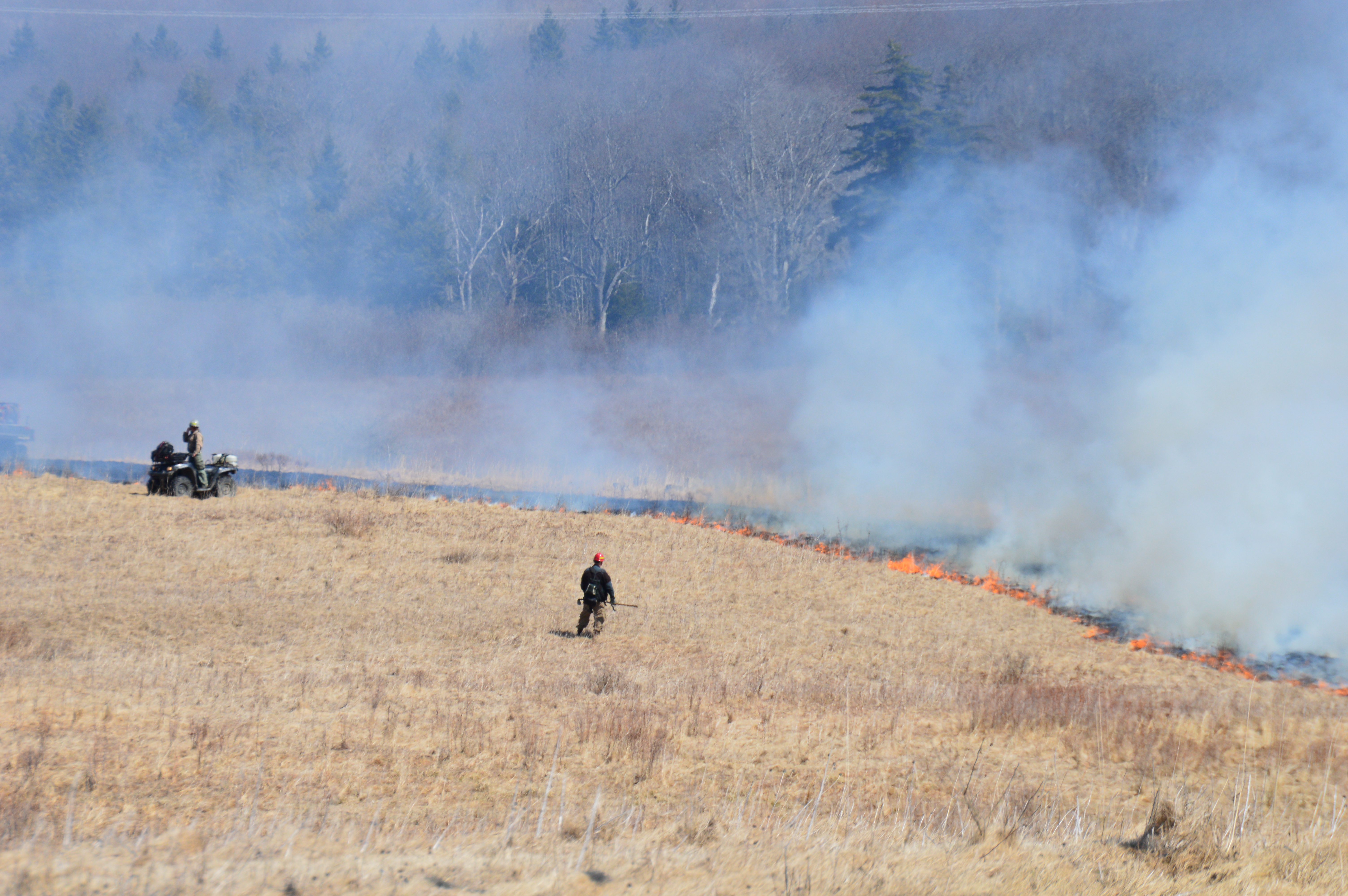 Staff monitoring a controlled burn in a field.