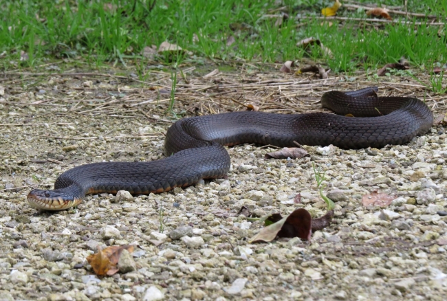 Copperbelly water snake. The copperbelly water snake, an endangered species, is found in southern Michigan and northern Indiana and Ohio. It feeds primarily on amphibians, mostly frogs and tadpoles. Copperbelly water snakes need shallow wetlands along the edges of larger wetlands complexes where they can hunt for frogs, but they also require multiple wetland types as well as adjacent uplands.